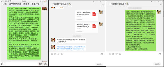为学习传承老一辈科学家的精神,按照京区事业单位党委和力学所党委的部署,2020年4月15日至21日,研究生一支部各党小组分别通过微信群交流及视频会议的方式召开了“诵读科学经典,弘扬科学精神”主题党日学习活动,此次活动由各党小组组长负责召集并主持。通过在线分享与讨论,各位党员同志相互交流所思所想,更加全面、深刻地学习了老一辈科学家们的科学精神,也明确了今后自己的努力方向。