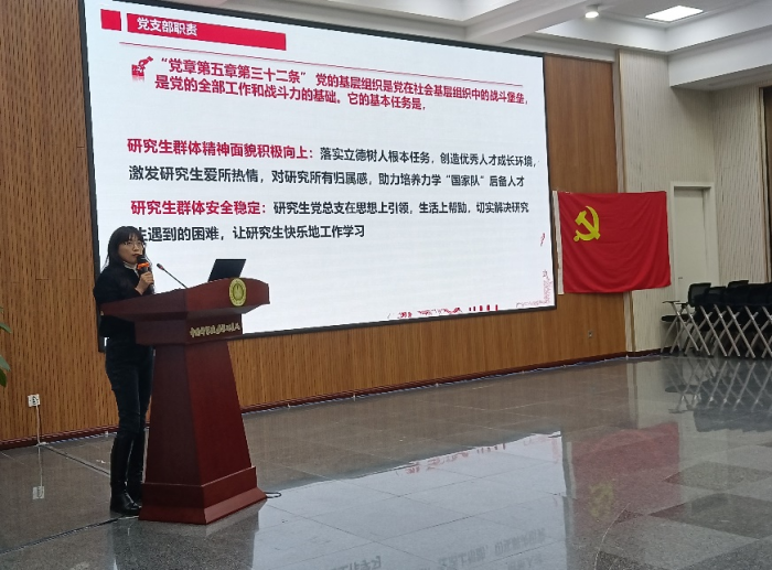 党总支报告了“三个清单”的落实情况。2023年党总支以推动研究生思想政治教育为目标,以“三个清单”为行动指南,围绕研究生群体的思想引领和安全稳定开展系列工作。报告分析了思想政治教育工作中存在的问题,汇报了下年度的工作思路。研究生4个党支部支委分别进行了工作总结和展望。