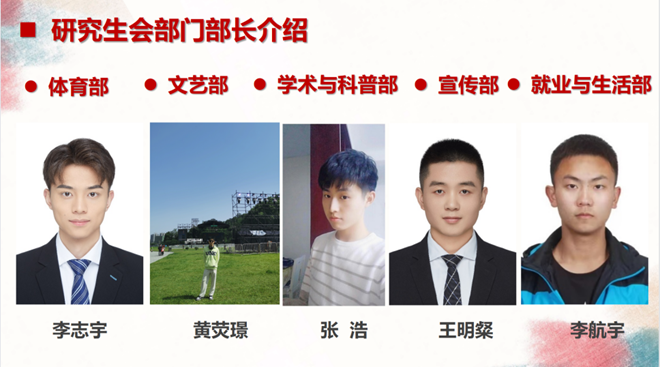 首先上一届研究生会主席邱鑫总结了研究生会过去一年的工作情况,包括组织架构、活动开展情况等各个方面的工作。邱鑫表示工作虽然充满挑战,但在研究生会所有成员的共同努力下,工作得以圆满完成。接着新一届主席团王泰然、杨俊娜介绍了研究生会各部门职责和概况。