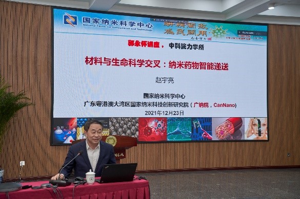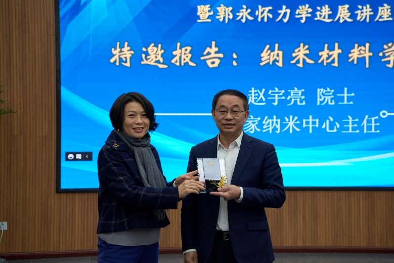 赵宇亮为研究生作讲座。他介绍了我国医用纳米技术对重大疾病和药物递送领域的重要作用,从国家战略需求出发,讨论了智能纳米机器的设计原则与发展趋势,根据基础和应用两方面面临的挑战,分析了智能纳米机器研究中的关键科学问题和未来发展方向。通过讲座,让研究生全面了解纳米材料的研究进展和发展前景,认识到学科交叉不仅是突破人类科学研究能力的创新范式,也是构建引领未来科技能力的重大战略。随后,刘桂菊为赵宇亮颁发了郭永怀力学进展讲座纪念奖杯。