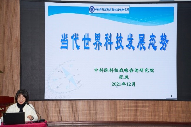 张凤为研究生作邀请报告。她全面介绍了材料、信息、空天、农业、环境等领域世界科技发展态势,以及信息时代大数据工具对科学研究的作用,解析了当代亟待解决的科学前沿问题与世界科技发展的焦点问题。