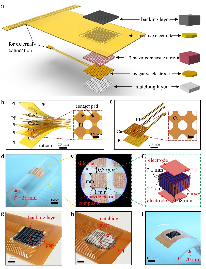 图1. BPAUT展示。a)BPAUT结构展示。b)多层柔性正极。c)柔性负极。d,e,f)柔性CPP压电阵元阵列。g)背衬层。h)匹配层。i)BPAUT弯曲展示