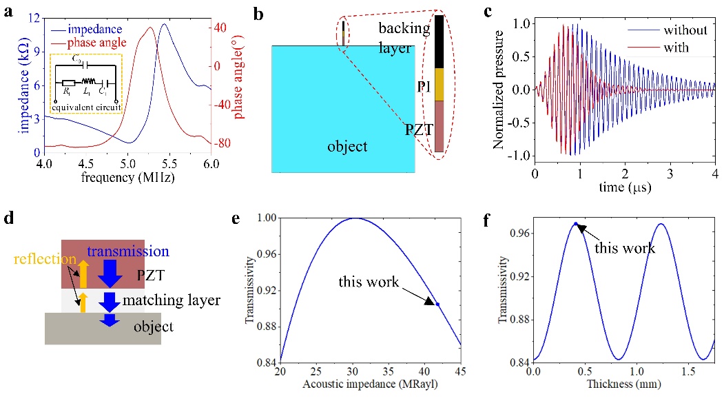 图2. BPAUT部件的性能。a)压电阵元的阻抗谱曲线和相位角谱曲线。b,c)背衬层性能的模拟(COMSOL)。d,e,f)匹配层性能的计算