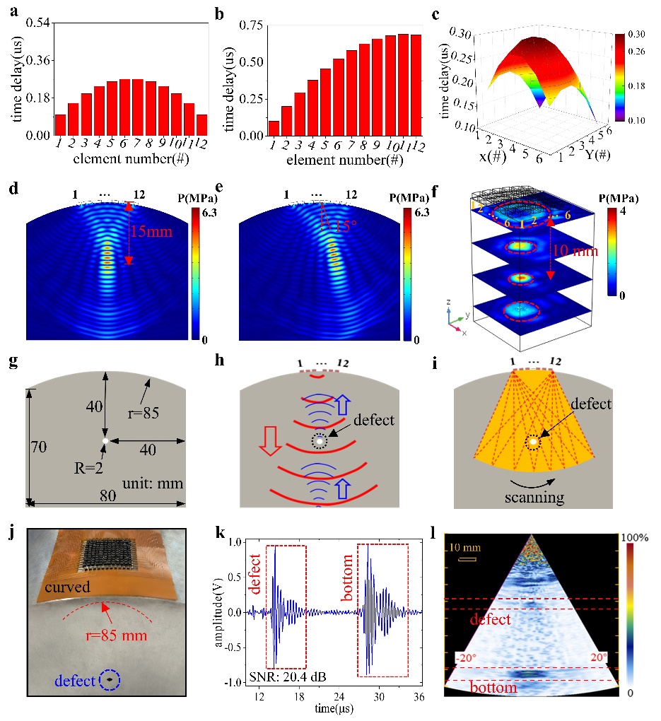 图4. 脉冲回波和扇形扫描实验。a,b,c)延时法则。d,e,f)可视化声场(COMSOL)。g)曲面测试块。h)脉冲回波原理。i)扇形扫描原理。j)BPAUT贴合到曲面测试块。k)脉冲回波实验的回波曲线。l)扇形扫描实验的缺陷成像图