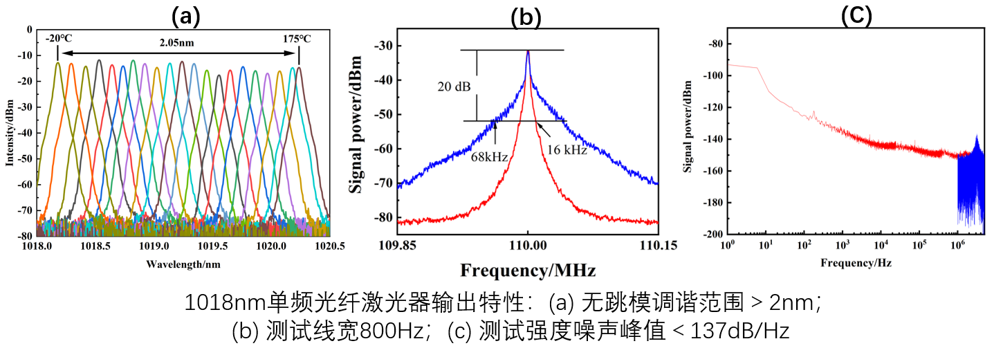 力学所引力波实验中心研究团队针对里德堡微波量子雷达迫切需求的509nm高性能单频光源开展研究,以钱学森“工程科学”思想为指导,发展了DBR型1018nm高性能单频种子源,首次实现无跳模调谐范围扩大至2nm以上,解决了DBR型单频光纤激光器跳模问题,同时具有超窄自由运转线宽(800Hz)和低强度噪声峰值(-137dB/Hz),扫除了DBR型单频光纤激光器工程应用的最后技术障碍。
