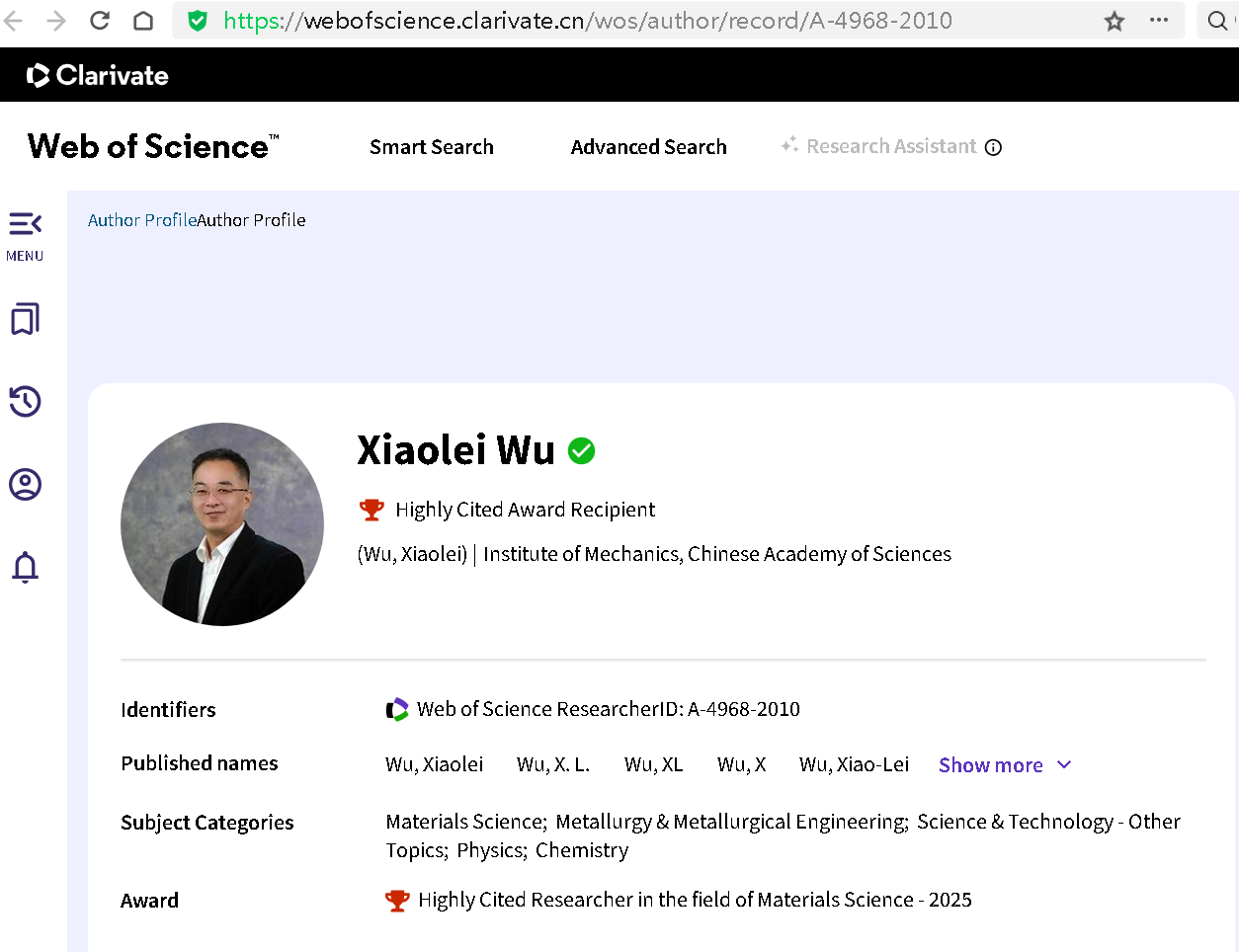 近日,科睿唯安(Clarivate)发布了2025年度“全球高被引科学家”(Highly Cited Researchers 2025)名单,力学所武晓雷研究员入选材料科学领域的全球高被引科学家。 科睿唯安每年发布“全球高被引科学家”名单,旨在遴选并表彰在全球各学科领域内产生广泛且重要学术影响力的顶尖科研人员。入选学者均在其研究领域发表了多篇高影响力论文,其被引用次位于全球同领域前1%,彰显了他们在国际科学界的卓越贡献与领先地位。 武晓雷研究员主要从事金属材料微结构与...