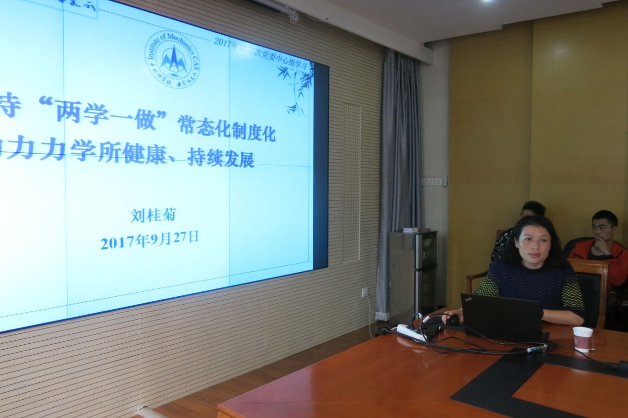 9月27日,力学所召开了2017年第三次党委中心组学习会。会上,党委书记刘桂菊讲党课,纪委书记戴兰宏作主题发言。所领导班子成员、所党委委员、职能部门负责人、实验室正副主任、党支部支委等50余人参会。会议由刘桂菊同志主持。