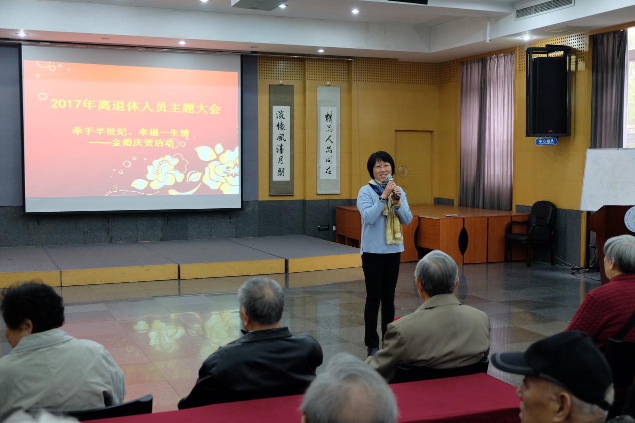 厉文萍宣布大会开始,50多对身着盛装的金婚夫妇伴着婚礼进行乐曲,手挽着手列队进入了会场,并一一进行了自我介绍。之后,刘桂菊发表了讲话,代表秦伟所长、所领导及其本人祝老人们金婚快乐、身体健康、阖家欢乐。同时,对离退休同志为所里做出的贡献给予了高度评价,并表示了衷心的感谢,表达了所里对离退休工作的重视。王薇在会上为金婚老人送上了美好的祝福。最后,金婚老人代表狄建华、薛以年分别发言,他们回顾了各自五十年来同甘共苦、相濡以沫的家庭婚姻生活。尽管经历不尽相同,但无不是与祖国同呼吸、共命运。他们也表达了对国家蒸蒸日上的发展以及十九大胜利召开的喜悦之情。整个会场充满了喜庆欢乐的气氛。