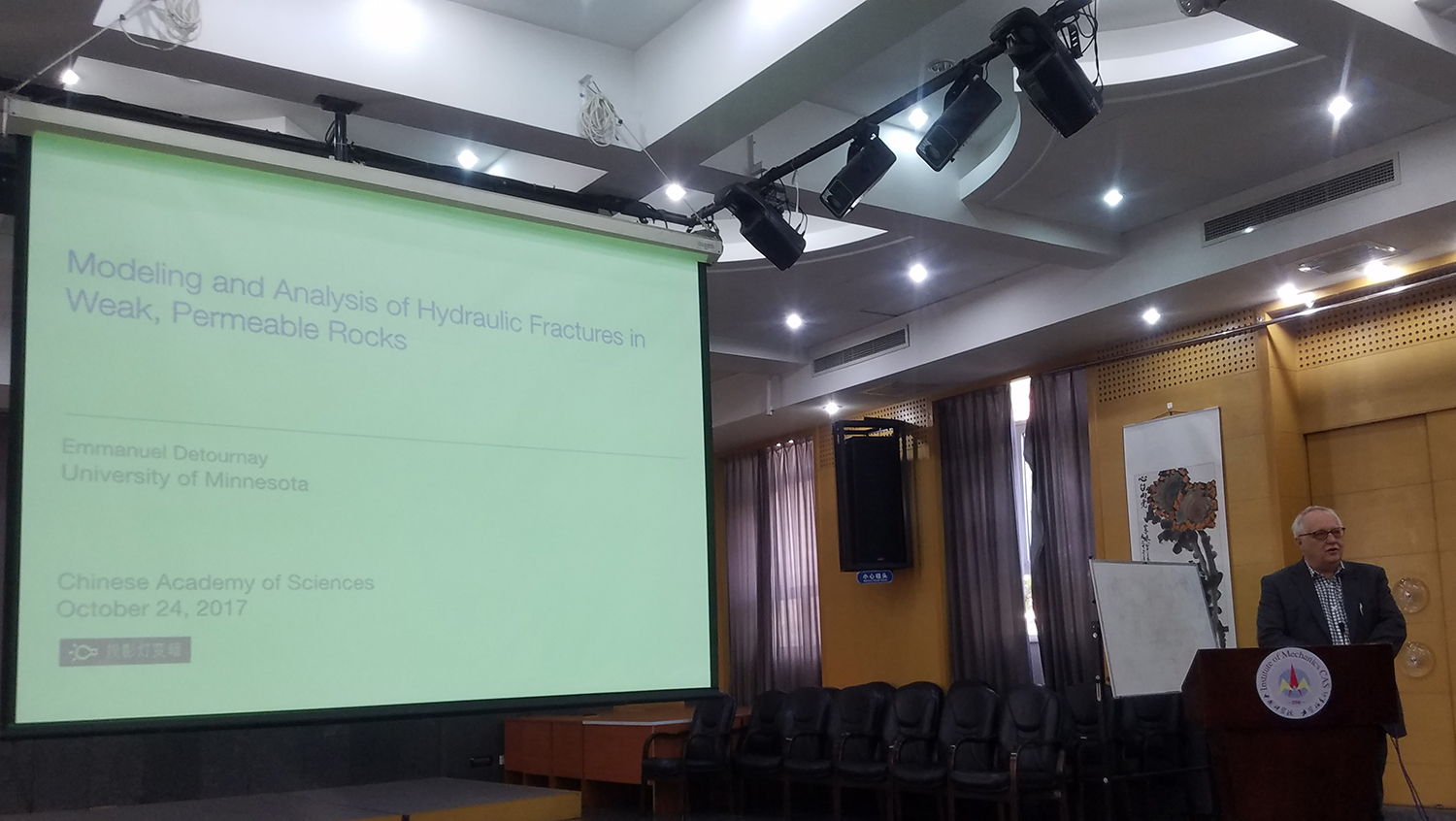 10月24日,应非线性力学国家重点实验室赵亚溥研究员邀请,水力压裂国际权威学者、美国工程院外籍院士、美国明尼苏达大学土木、环境与地质工程系Emmanuel Detournay教授携夫人Christine Detournay博士访问力学所,并作题为“可渗的软弱岩石水力压裂的建模和分析”(Modeling and Analysis of Hydraulic Fractures in Weak, Permeable Rocks)的学术报告。郑哲敏院士、李世海、鲁晓兵、陈伟民、袁泉子、王柏懿等相关领域的研究人员和研究生参加报告会。报告会由赵亚溥研究员主持。