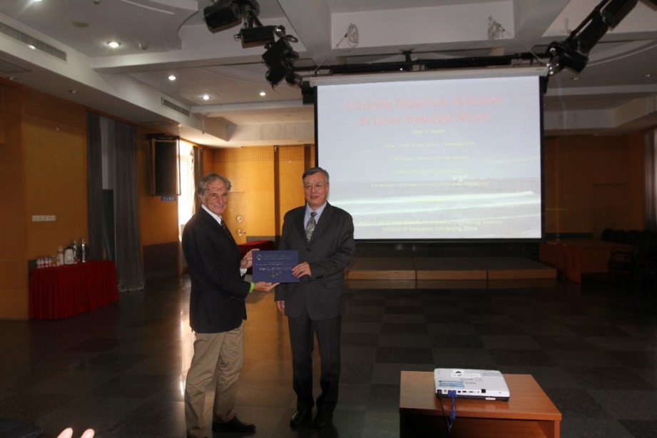 4月8-18日,加州圣迭戈分校Marc Meyers教授应邀访问力学所,作题为 “Extreme Materials Behavior in Laser-Induced Shock”的钱学森工程科学讲座。所长秦伟、中科院院士白以龙,以及来自所内外等120余位科研人员和研究生参加了报告会。会议由戴兰宏研究员主持,并致欢迎辞。报告开始前秦伟所长为Meyers教授颁发了中国科学院力学研究所“钱学森工程科学讲座教授”证书。