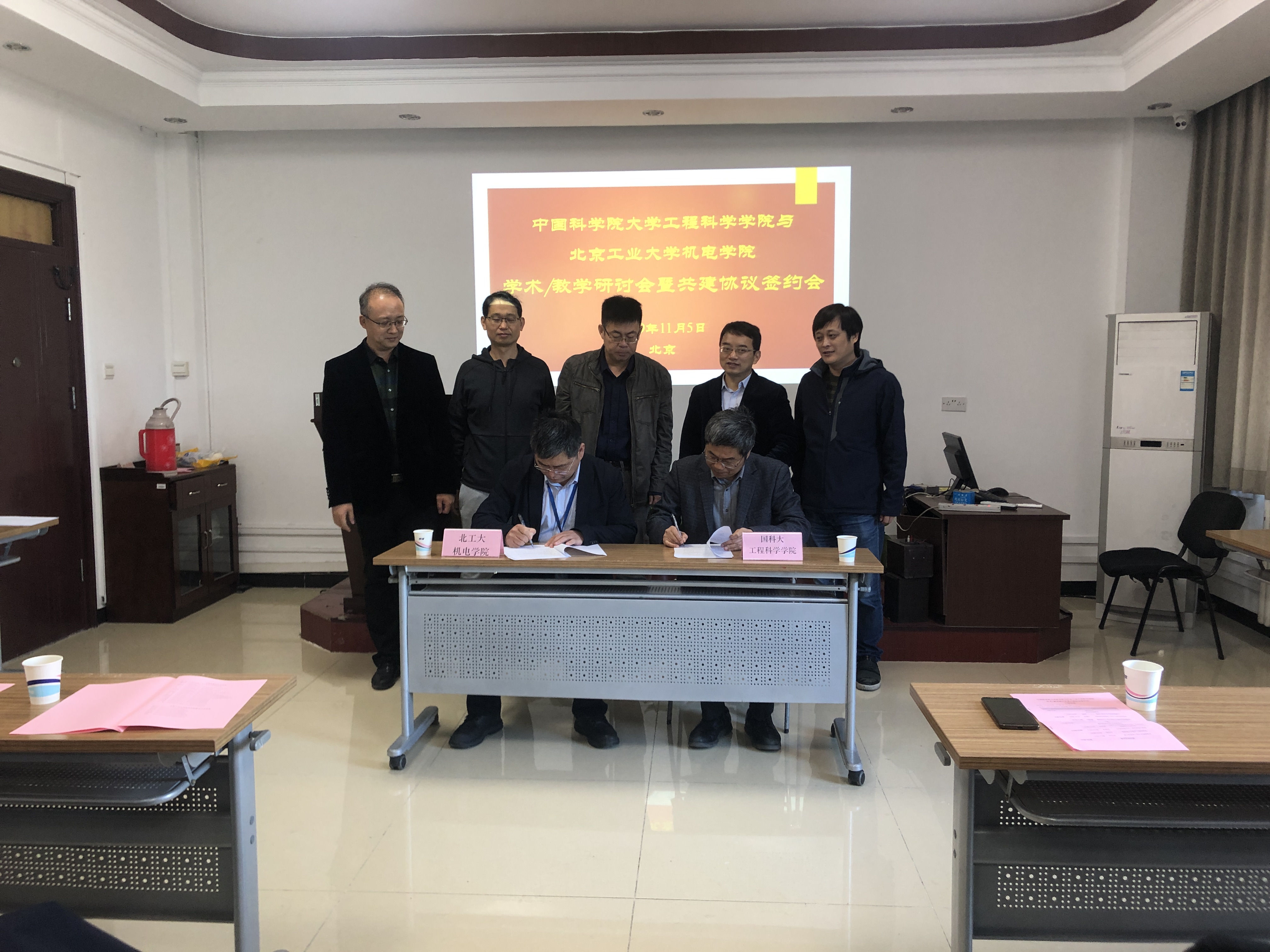 双方举行共建签约仪式,陈树君和戴兰宏分别代表北工大机电学院和国科大工程科学学院签订共建协议。
