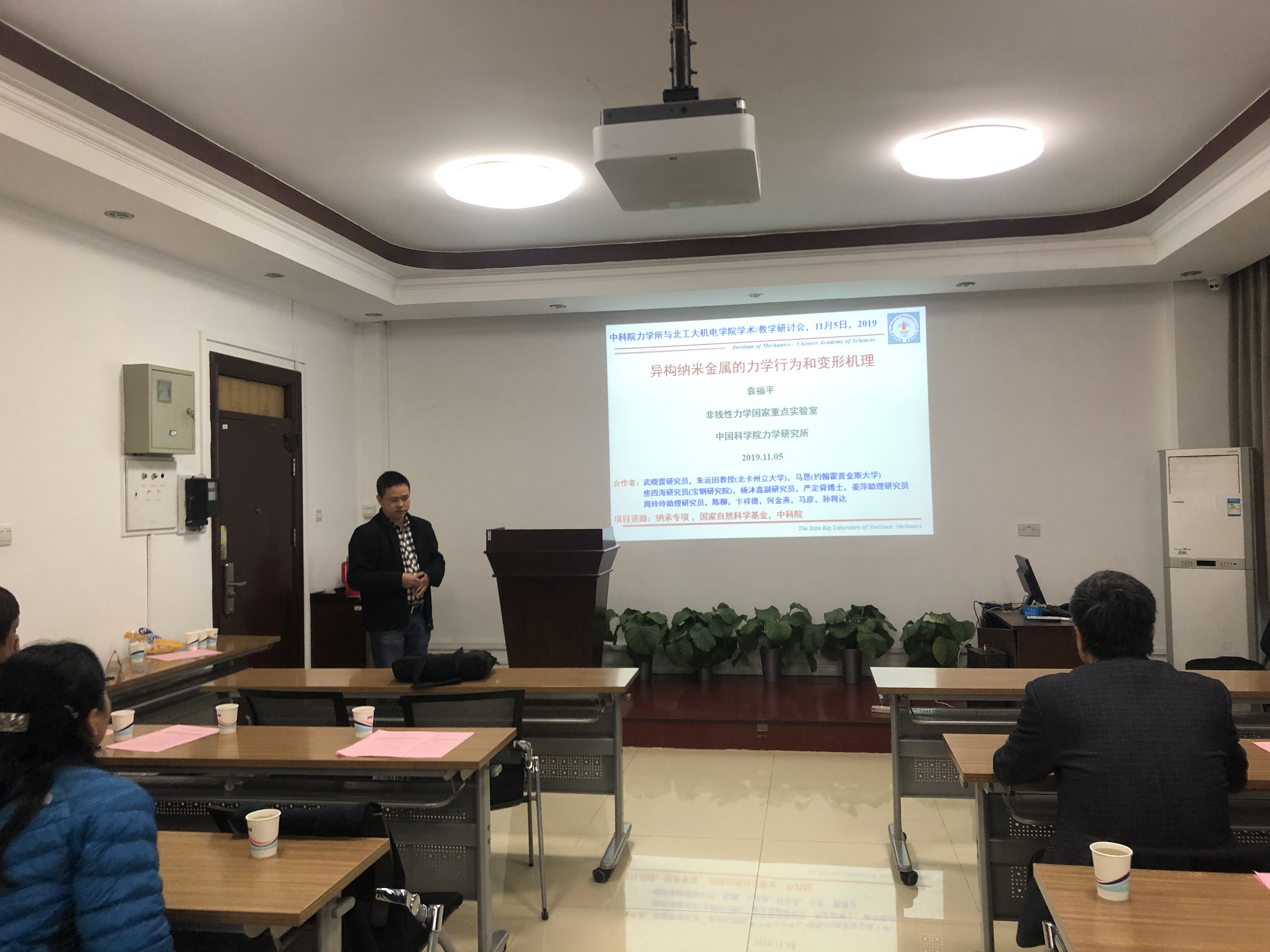 随后,双方组织召开了学术报告会。力学所康琦研究员、袁福平研究员分别作了题为《微重力科学及空间实验研究》、《异构纳米金属的力学行为和变形机理》的学术报告,北工大机电学院刘赵淼教授作了题为《微流控芯片的局部流动规律和液滴操控》的学术报告。杨晓东作了题为《北京工业大学力学学科介绍》,介绍了北工大力学学科的科研团队、研究方向以及对双方合作的设想。
