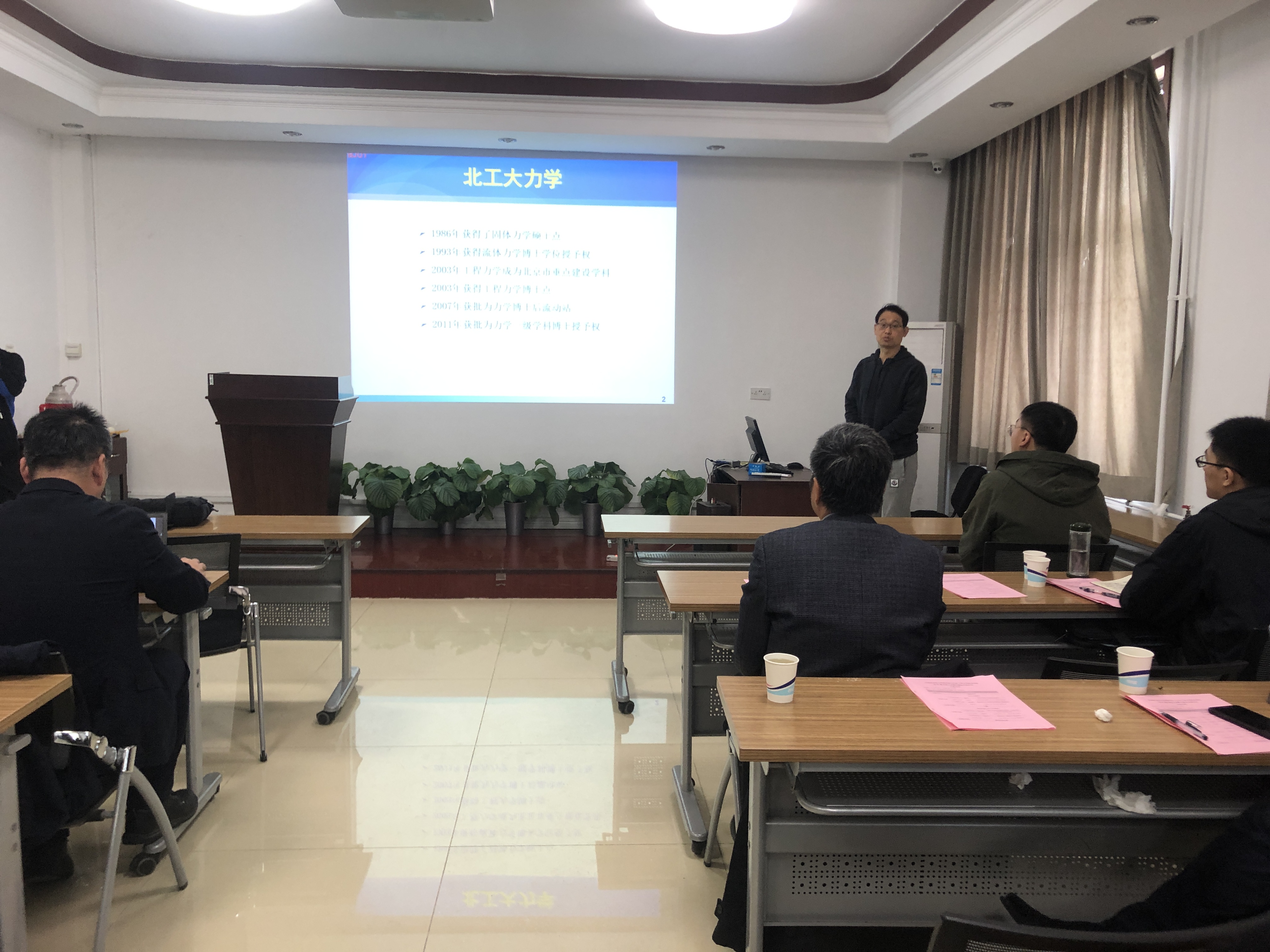 北工大机电学院院长陈树君对力学所到会人员表示热烈欢迎。他希望通过双方的合作切实推进北工大力学学科的发展。机电学院会尽最大努力为力学所提供联合培养研究生名额,聘请优秀的研究人员担任特聘教授和兼职导师,促成双方学术研究的合作。