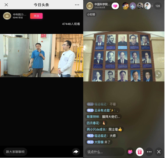 5月23日,力学所举办了以“力学-笃行”为主题的第十六届公众科学日活动。本次活动联合今日头条、抖音等新媒体平台,在中关村园区和怀柔园区分别设置直播端,采用线上直播形式开展,吸引了近五万名观众。
