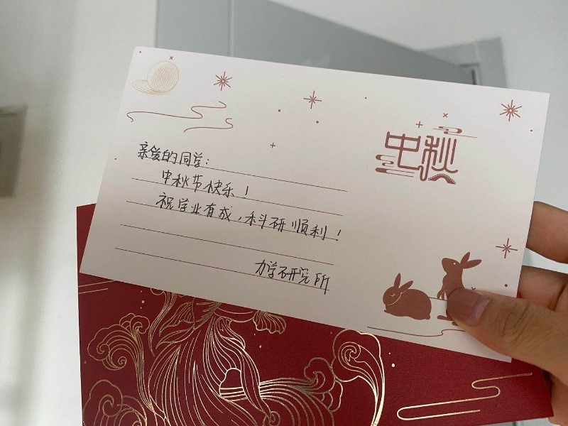 最后,每个同学都收到了来自研究所的中秋贺卡、中秋月饼和小零食,深深感受到了来自力学所大家庭深深的温暖。