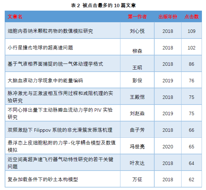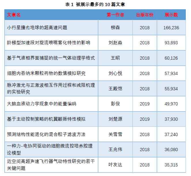 数据显示,2020年1月1日到2020年12月31日,《力学学报》所发表的文章推送总计407万多篇次,平均每天10,980篇次,涉及843份期刊,其中包括Science,PNAS,Science Advances,Annual Review of Fluid Mechanics等国际顶级期刊,以及在物理学、化学、工程、材料、医学等诸多相关领域的国际期刊。其中被展示最多、被点击最多的10篇文章如下表1、表2。
