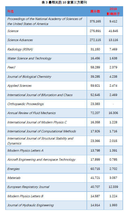 除了快速提升国际影响力和极大增加文章阅读量之外,通过大数据的精准推送服务还显著提升了《力学学报》文章的国际引用次数。最相关的10家第三方期刊如下表3。