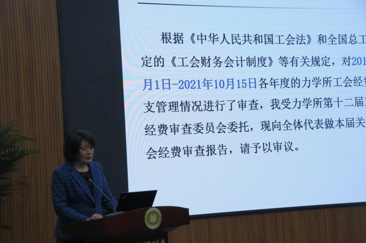 分管工会工作的党委委员杨国伟代表第十二届工会委员会和第九届职代会主席团做了题为“打造职工温馨之家,促进创新文化发展”的工作报告,对五年来力学所工会/职代会工作做了全面、客观、深刻的总结和回顾,指出了本届工会/职代会工作存在的不足和差距。第十二届工会经费审查委员会主任邹定辉作了工会经费审查报告和工会财务报告。财务与资产处副处长王莉婷作了研究所财务报告。大会审议并通过了上述报告。