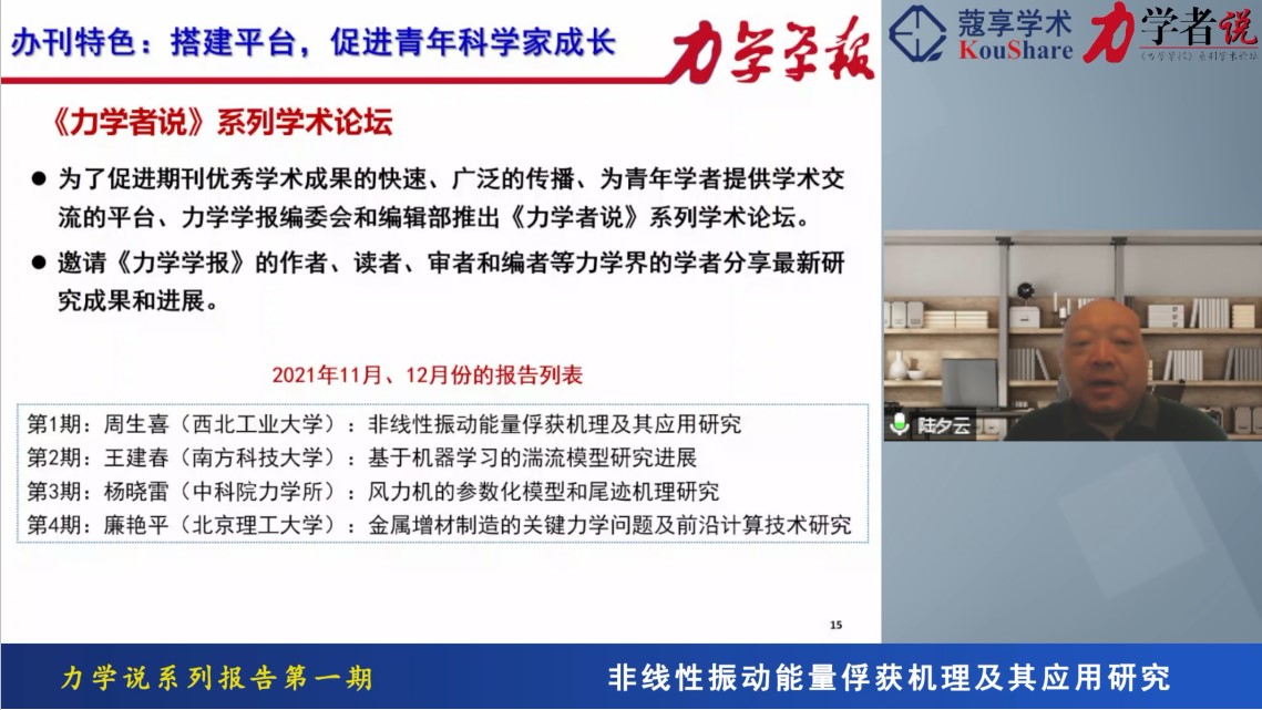 为传播优秀成果、加强学术交流,力学所与中国力学学会联合主办的《力学学报》于11月13日组织举办了《力学者说》系列学术论坛第一期。本期论坛由《力学学报》主编陆夕云院士主持,并邀请《力学学报》第11期《振动能量俘获》的专题客座主编、西北工业大学航空学院周生喜教授做学术报告。学术论坛线上线下同步进行,同时在腾讯会议和蔻享学术平台直播,吸引了2000余人次观看。