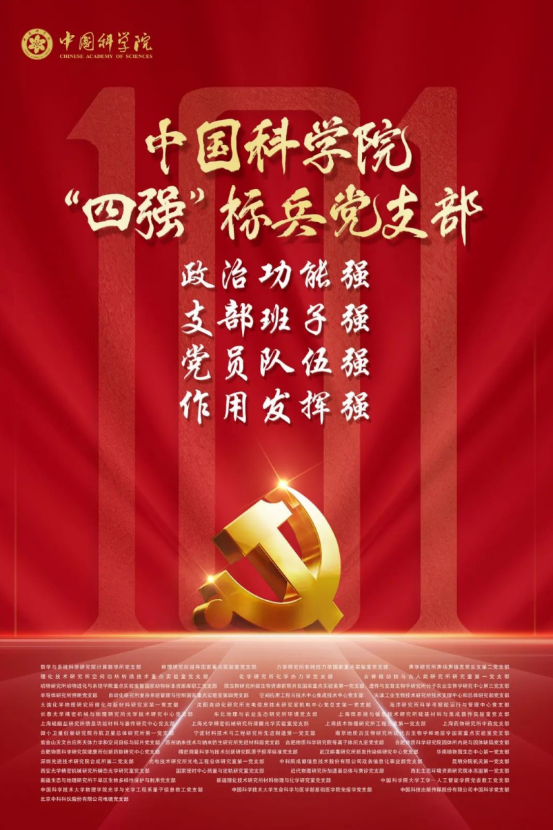 为加强基层党组织建设,充分发挥基层党组织的战斗堡垒作用和党员的先锋模范作用,推动中国科学院科研团队和广大科技人员进一步传承践行科学家精神,促进党建工作和科技创新工作深度融合,中国科学院在全院范围内共评选出50个基层党支部和30个科研团队,分别授予中国科学院“四强”标兵党支部称号和中国科学院“科技创新先锋团队”称号。