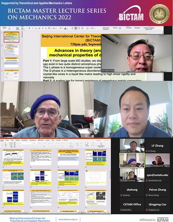 2022年9月16日,力学所策划组织的北京国际力学中心力学大师讲座系列(BICTAM Master Lecture Series)2022年第二期活动顺利举办。美国科学院院士、美国加州理工大学教授William A. Goddard III应邀作大师讲座报告。本次讲座吸引了来自中国、美国等国家和地区的200多名专家学者在ZOOM会议室参会,通过力学学会视频号观看直播的人数达到800余人。