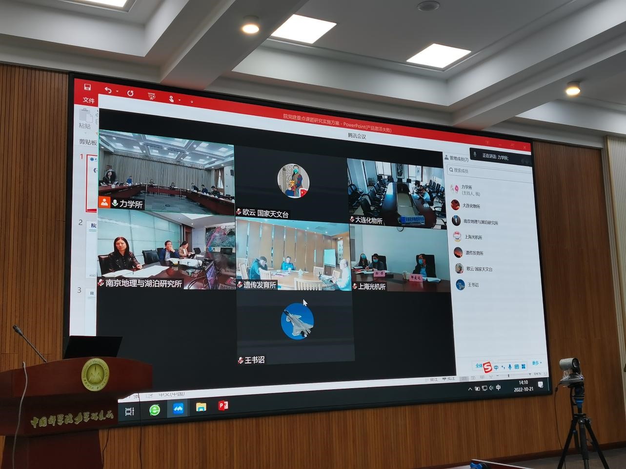 10月21日下午,中国科学院党的建设与思想政治工作研究会重点课题《在重点实验室等科研平台中党组织发挥战斗堡垒作用研究》协调会在力学所召开,会议采取线上、线下结合的方式进行,由课题组组长、力学所党委书记、所长刘桂菊主持。直属机关党委副书记刘京红,上海光机所党委书记邵建达、纪委书记彭芳,遗传发育所党委书记、副所长邢雪荣,南京地湖所党委书记、副所长谷孝鸿,国家天文台纪委书记欧云,力学所纪委书记叶海华,以及课题组相关同志参加会议。