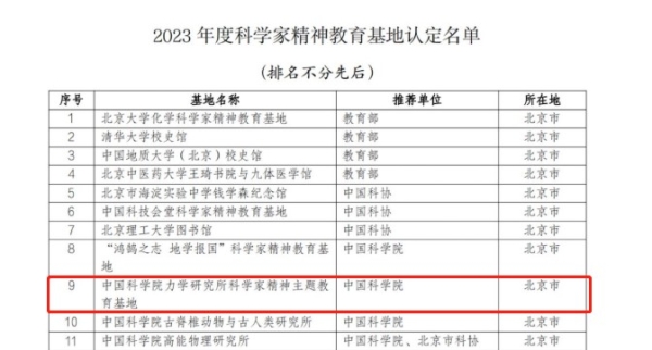 5月30日,中国科协、教育部、科技部、国务院国资委、中国科学院、中国工程院、国防科工局联合发布2023年度科学家精神教育基地认定名单,力学研究所入选。