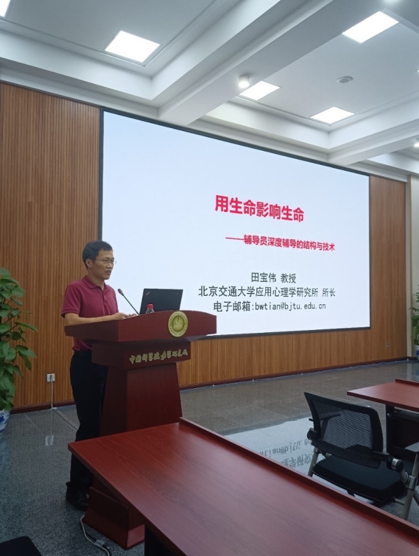 田宝伟作了题为“用生命影响生命——辅导员深度辅导的结构和技术”的报告。他列举了当前研究生群体存在的心理问题及表现,引发辅导员们的广泛讨论。报告以“求助者会向谁求助”“辅导员付出了什么才能让来访者感到得到了帮助”以及“辅导效果不佳的表现”等为切入点,引出优秀辅导员需要具备“知识”“技能”“自我概念”“个性”“动机”五大方面的专业化内涵。报告指出内心充满“爱”是助人的前提,辅导员提升深度辅导水平要从“修心”和“修术”两方面结合。首先要有一颗帮助别人的心,要对学生充满爱与理解,其次提升与人交往的能力、敏锐的感觉和了解心理能力,自身要有健康的心理和态度,最后提升深度辅导的专业能力。报告介绍了深度辅导的结构:建立关系联盟,使用倾听、复述和共情去探索和澄清问题,使用ICAD处理来访学生的内心感受,使用问题解决7步法帮助来访学生制订解决方案,进行总结和整合。报告最后以“要用洋溢着的爱心去助人,修术更要修心”寄语各位辅导员。