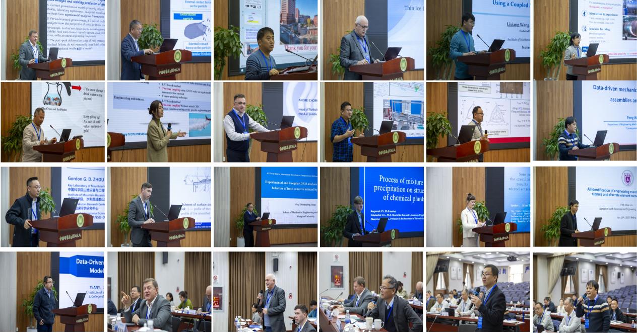 在专题报告环节,白俄罗斯国立大学Mikhael Zhuravkov教授分享了深部采矿地质力学中耦合FEM-DEM算法的研究成果,为复杂工程仿真提供了新思路。白俄罗斯国立大学Mikhail Zhuravlev、Aleh Kanavalau、Dzianis Marmysh、Ivan Karpovich等学者分别就深部采矿地质力学、薄冰离散元建模、脆性材料加工仿真及化工设备沉淀过程模拟等方向,展示了在多尺度耦合算法与复杂工程仿真方面的系列成果。力学研究所安翼副研究员展示了数据驱动的颗粒碰撞润滑模型研究与应用,王理想助理研究员介绍了基于MPM-CDEM耦合方法的月壤钻进特性研究进展。大连理工大学季顺迎教授系统介绍了可变形颗粒与结构的离散元方法及其在复杂材料模拟中的创新应用。这些报告生动展现了中白双方在颗粒计算力学领域的深厚技术积累,也预示着双方在复杂工程模拟领域的合作正迸发出巨大的创新潜力。