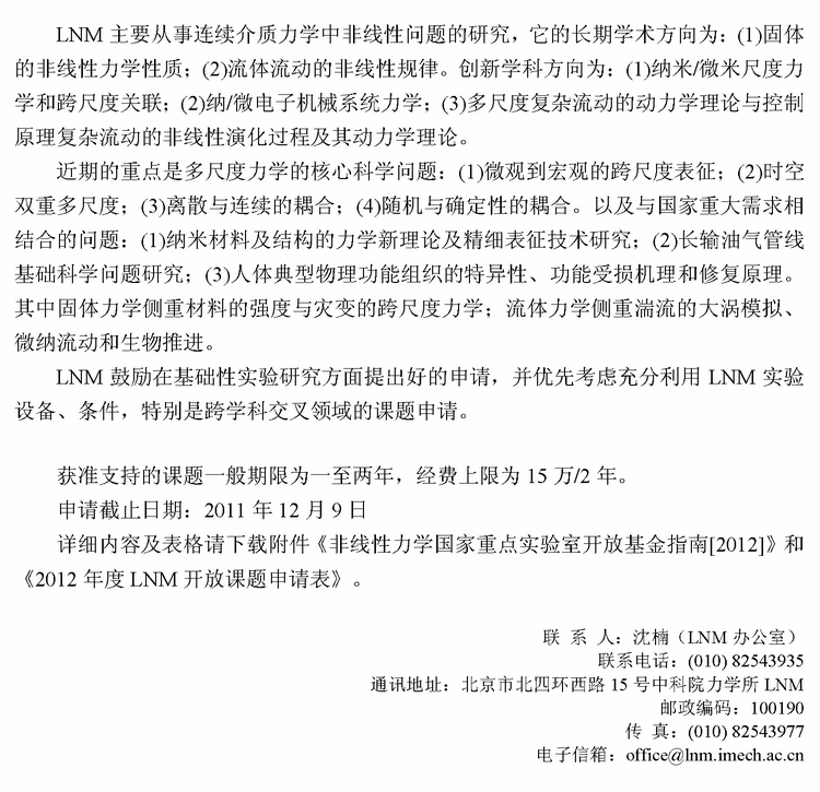 非线性力学国家重点实验室2012年度开放基金指南