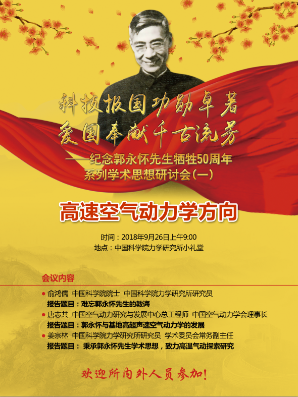 2018年12月5日是郭永怀先生牺牲50周年纪念日。为激励和引导广大科技工作者继承和发扬老一辈科学家的学术思想和科学精神,弘扬爱国奋斗精神,建功立业新时代,积极投身科技创新实践活动,面向国家重大需求,在相关领域探讨我国及力学所未来有持久生命力的学科长远发展方向,受所行政领导班子委托,所党委拟组织纪念郭永怀先生牺牲50周年学术思想研讨会等系列纪念活动。
