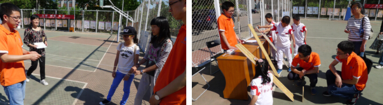在篮球场上,同学们观看了“力学科普主题展览”,并且体验了有趣的动手操作项目,包括“单项自锁”、“前仰后翻”、“巧扎气球”、“乒乓球投篮”等。通过动手制作,同学们不仅拥有了自己的作品,操作了完整的实验过程,还弄懂了实验中蕴含的力学原理,大家都非常有成就感。