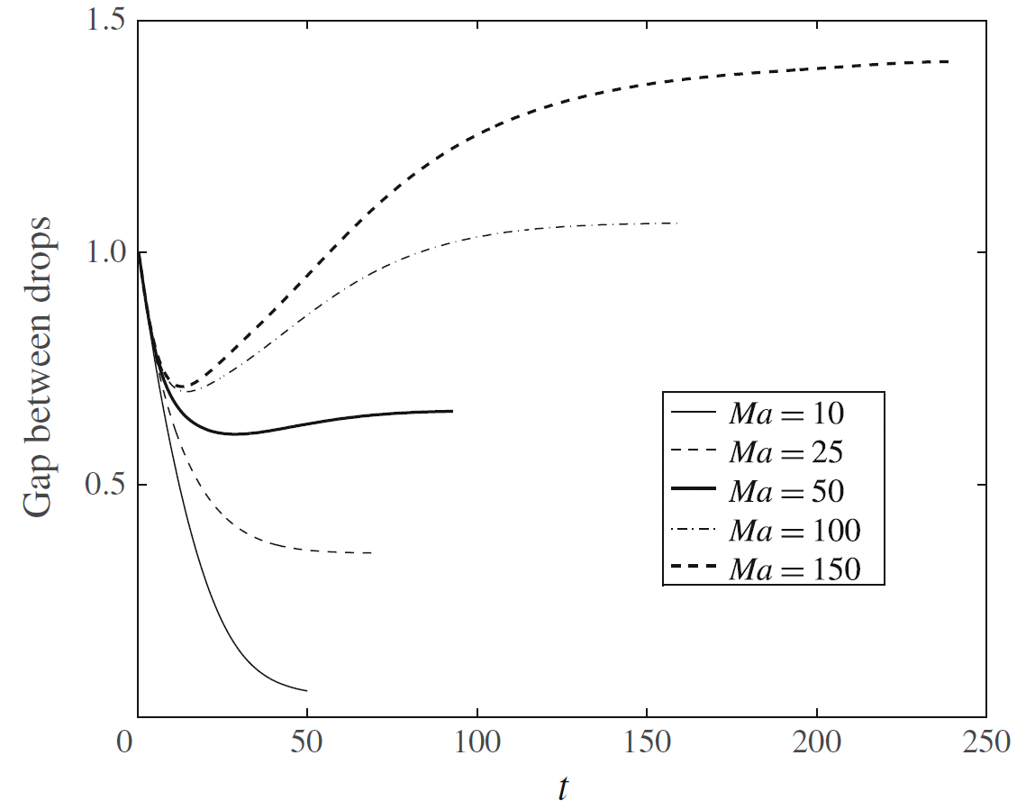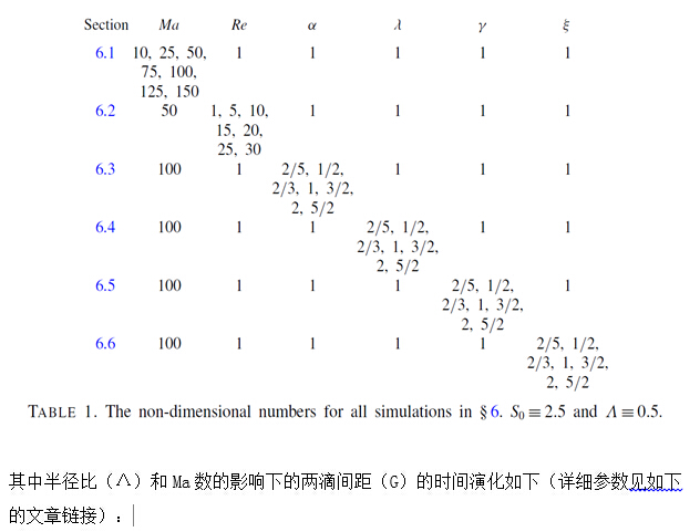 注意左图Ma=100,半径比趋于零的时候间距并非趋于零,而是0.3左右。右图中Ma数变小时两滴间距趋于零,容易发生液滴融合。