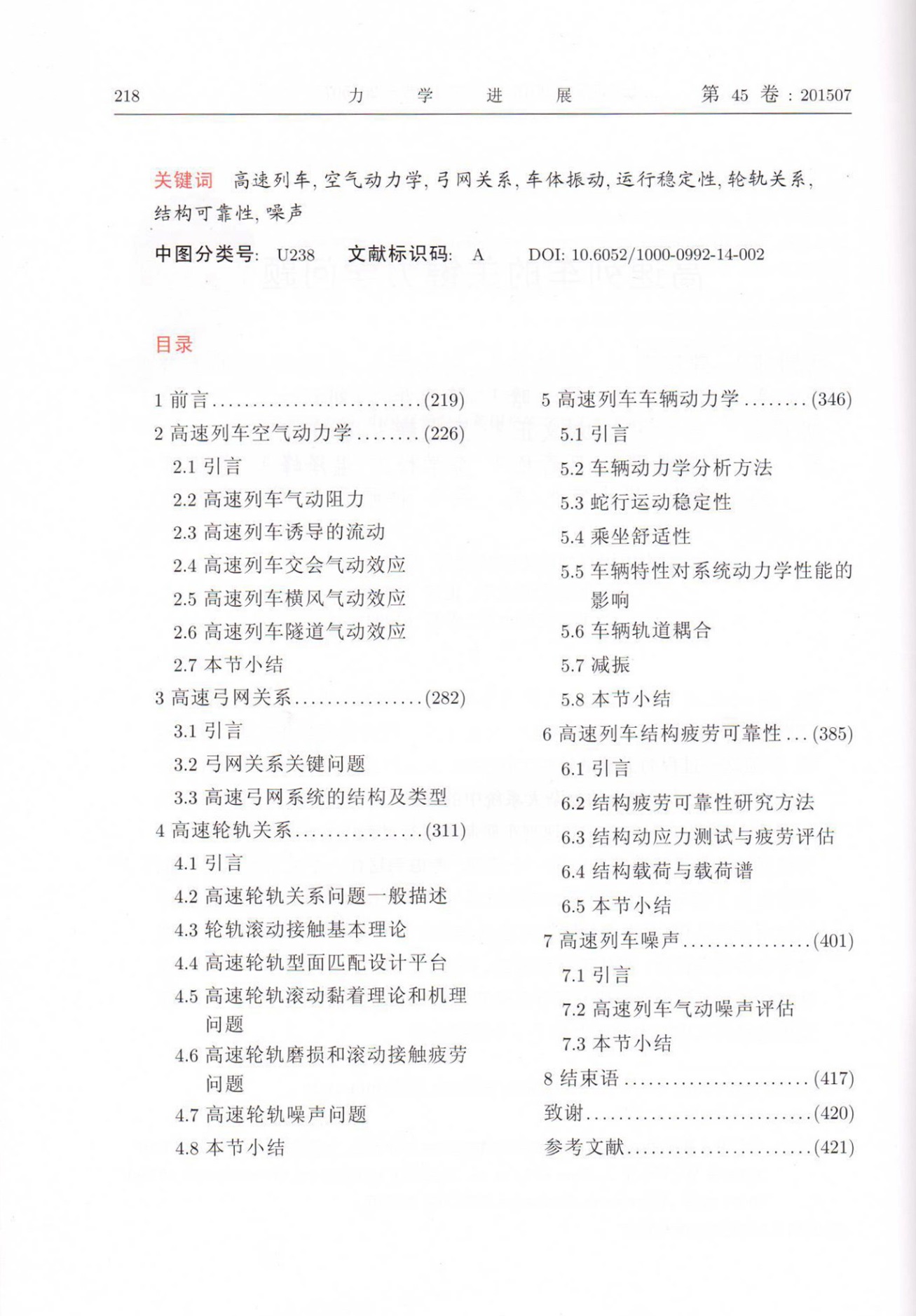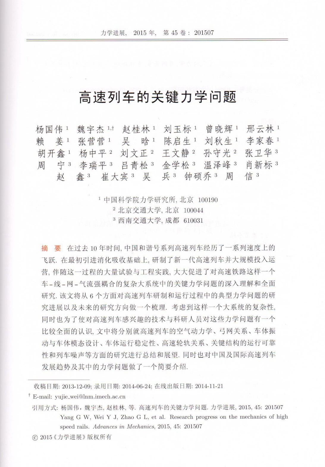 在《力学进展》樊菁主编的邀请下,力学所杨国伟、魏宇杰等科研人员组织国内研究团队,就现阶段高速列车运营过程中的典型力学问题、国内当前的研究进展做全面梳理并发表长篇综述文章(《力学进展》,45卷,217-460,2015年),就下一阶段的关键问题研究提出建议,其中包括: