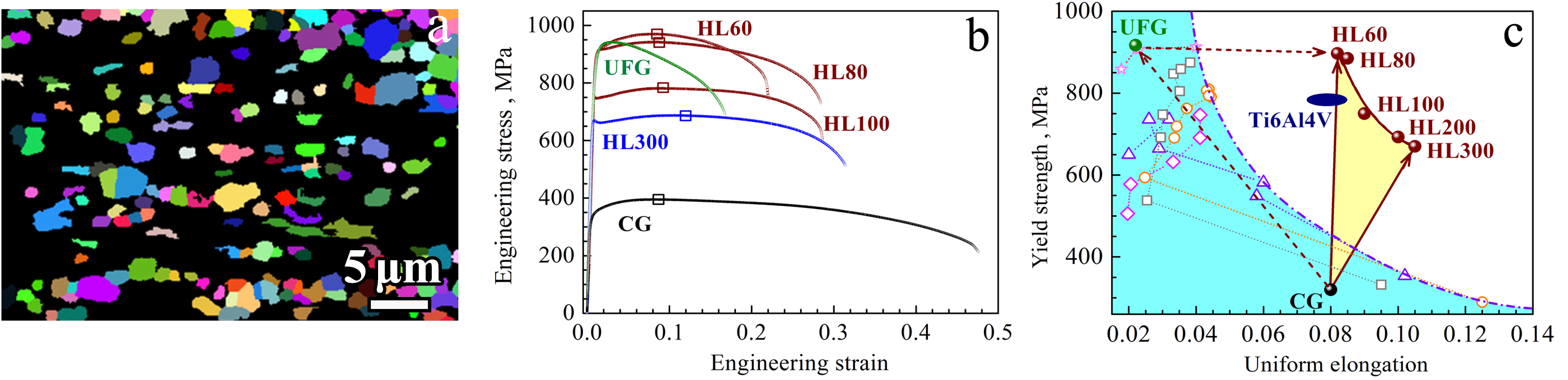 图1 (a) EBSD图片. 晶粒尺度1-5 μm的再结晶晶粒层片分布于纳米晶基体(黑色衬度). (b) “软-硬”层片微结构钛(HL)具有超细晶(UFG)的强度与粗晶(CG)的塑性. (c) “软-硬”层片微结构钛屈服强度和塑性的协同特性,综合力学性能比典型的钛合金还为优异.