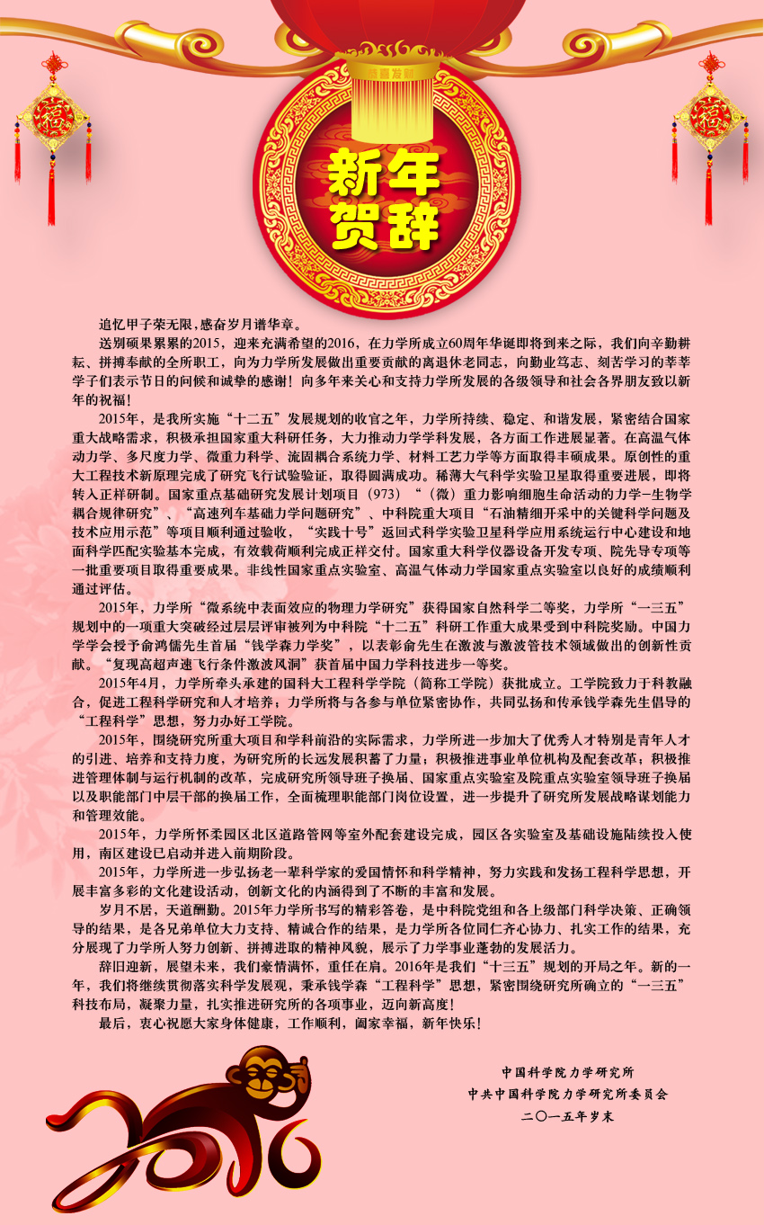 送别硕果累累的2015,迎来充满希望的2016,在力学所成立60周年华诞即将到来之际,我们向辛勤耕耘、拼搏奉献的全所职工,向为力学所发展做出重要贡献的离退休老同志,向勤业笃志、刻苦学习的莘莘学子们表示节日的问候和诚挚的感谢!向多年来关心和支持力学所发展的各级领导和社会各界朋友致以新年的祝福!