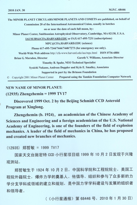 此次以郑哲敏、谢家麟、吴良镛、张存浩、屠呦呦共五位科学家名字命名的小行星是中国科学院国家天文台施密特CCD小行星项目组发现并获得国际永久编号,经国际天文学联合会小天体命名委员会批准而正式命名。