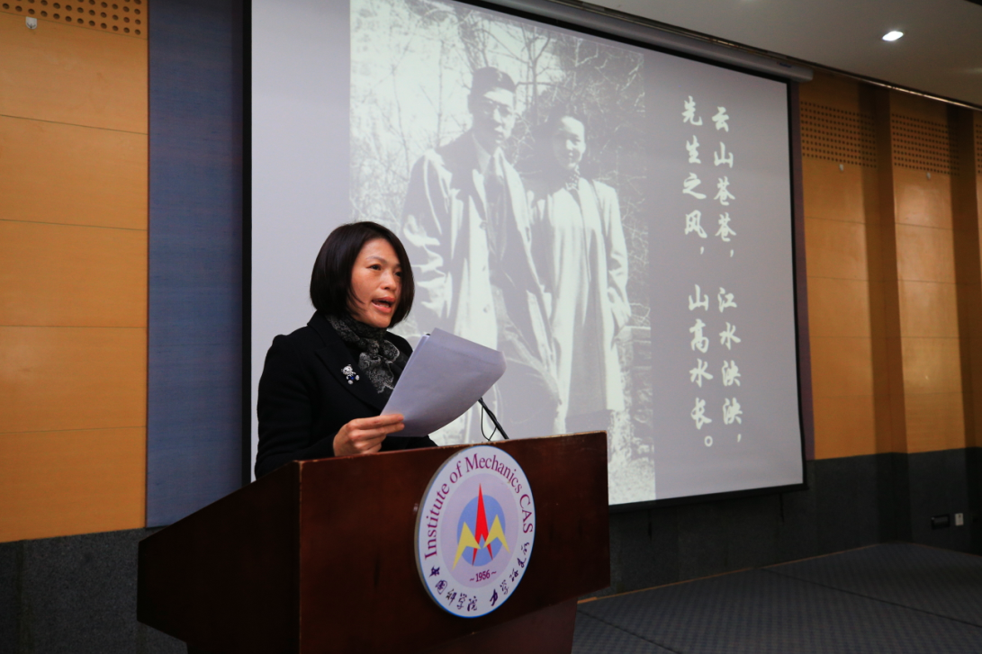 仪式的第一阶段,在力学所主楼礼堂召开了缅怀郭永怀和李佩先生纪念大会,力学所党委书记、副所长刘桂菊主持了纪念会。她介绍了郭永怀先生和李佩先生的生平,郭永怀先生一生光明磊落,学识渊博,以卓绝之能担国家之重任,用肝胆之心洒天地之爱,李佩先生一生淑质英才,傲骨琳琳。今天大家相聚在留下两位先生无数足迹的力学研究所,共同追忆他们的崇高品质和大仁大爱。