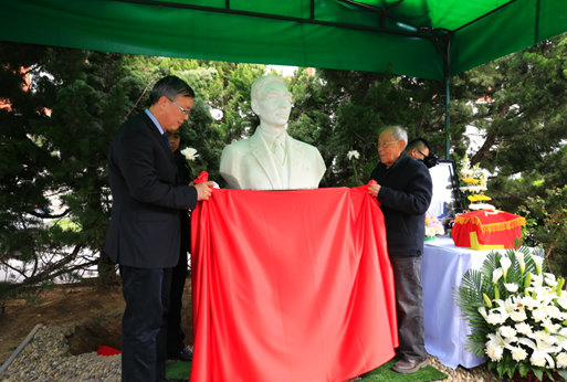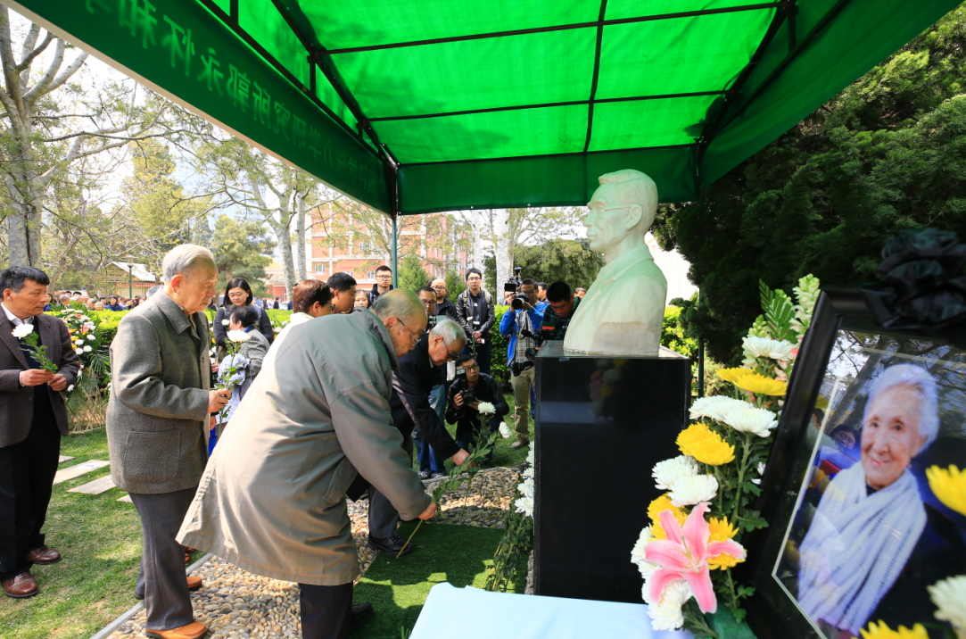 仪式的第二阶段,在力学所郭永怀塑像前举行了郭永怀和李佩先生合葬仪式。仪式由刘桂菊主持。力学所郑哲敏院士、力学所秦伟所长共同揭碑,“一对伉俪,两种传奇;怀瑾佩瑜,师表后继”,碑文赫然眼前。集体默哀后,两位先生的骨灰合葬在塑像下。最后大家在塑像前鞠躬致敬,向两位先生献花以表哀思。郭永怀先生、李佩先生一生忠于祖国、为国家的科研与教育事业殚精竭虑,他们坚持真理、品格高尚,是科技工作者的光辉典范,是时代的楷模。