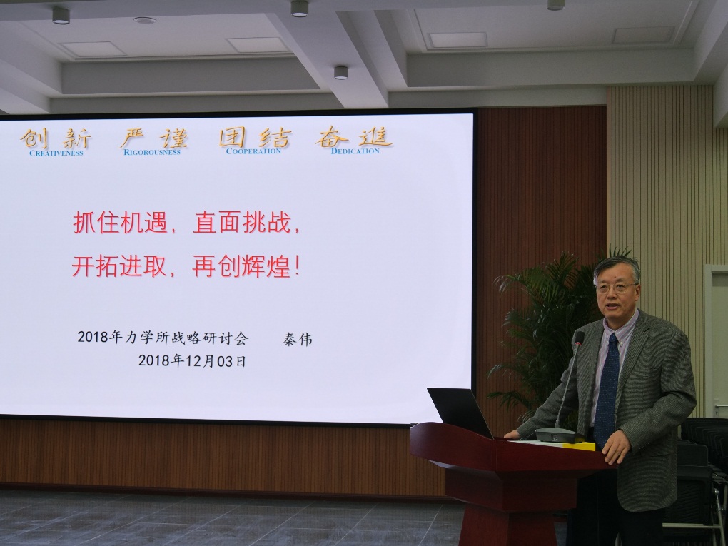 12月3日,力学所召开了2018年度发展战略研讨会,所长秦伟、党委书记、副所长刘桂菊、纪委书记戴兰宏、副所长尹明、魏宇杰以及全所副高以上研究人员、职能部门正副处长等200余人参加了会议。本次战略研讨会主题是“学习重温习总书记讲话精神,脚踏实地,攻坚克难,圆满完成十三五任务,有效推动力学及交叉学科进步。献计献策,形成合力,积极谋划十四五大发展,扎实推进复杂系统力学卓越中心建设”。