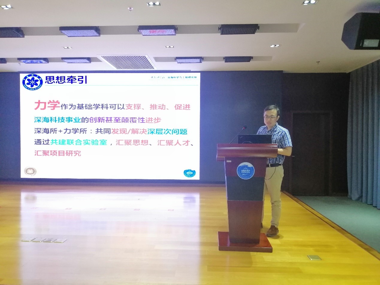 秦伟指出,深海所在深海工程技术与装备、深海科学问题研究等面取得了骄人的成绩,从装备、条件和设施上支撑了深海科学和海洋工程的研究。力学所在海洋工程领域有多年的研究积累和较强的研究团队,双方的科研人员在联合实验室的框架下已经开展了广泛而深入的合作,希望通过此次研讨会,在双方科研人员的交流和碰撞下,发掘出更多科学问题,促进联合实验室的长足发展,也希望力学所在海洋工程领域的研究工作能借助深海所先进的装备技术引向深海,引向世界一流。