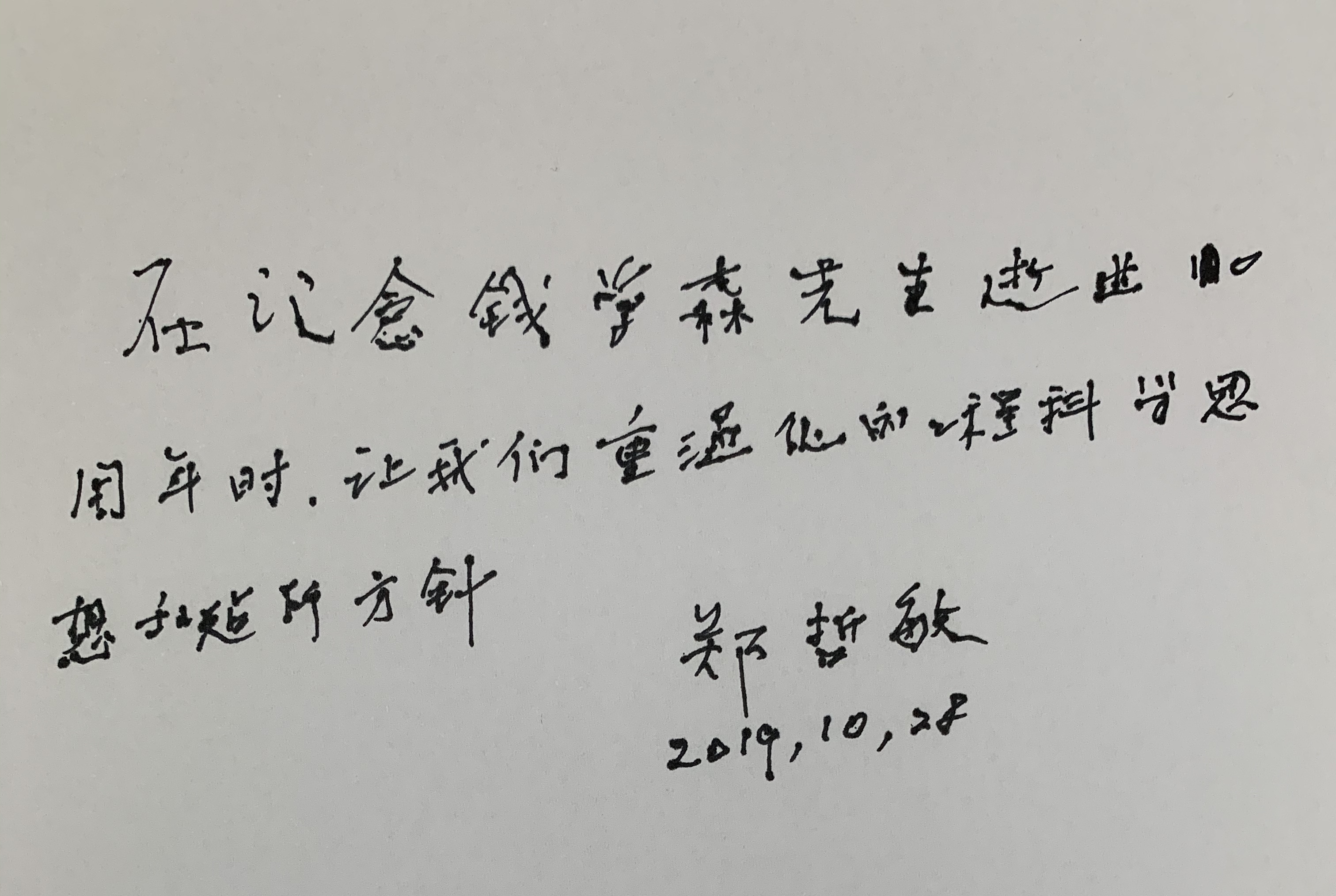 郑哲敏院士由于身体原因未能出席活动,亲笔书写:“在纪念钱学森先生逝世10周年时,让我们重温他的工程科学思想和建所方针。”由刘桂菊同志代为宣读。