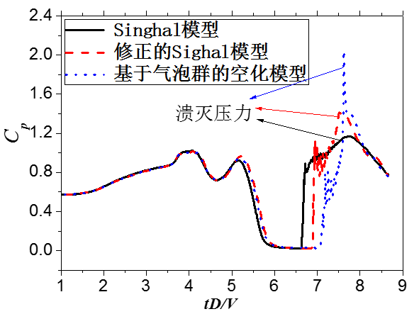 其次是细观结构对溃灭的影响机制。与当前最常用的Singhal模型进行对比,当前模型能够准确地刻画出由气泡数密度分布不均匀导致的局部高压。基于气泡群的模型获得的溃灭压力,与直接模拟获得的气泡群加速溃灭的特征一致。