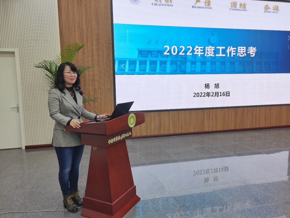 刘桂菊作题为《深入学习院工作会精神 收心聚力谋新篇》的报告,全面学习传达了2022年度院工作会议精神,对研究所今年的工作提出总体要求,并介绍了分管的人力资源处和中科力森公司的年度重点工作。她指出,力学所在过去一年来稳中求进、小步快跑、进展明显,但对标对表党中央和院党组要求,对照先进单位,还有差距。她强调,全所职工要进一步深入学习凝共识、坚持思路聚合力、谋划部署打好底、突出重点起好步、狠抓落实开好局、抓住时机求突破、改进作风强保障,围绕国家重大需求,聚焦主责主业,为强化国家战略科技力量、实现高水平科技自立自强作出应有的创新贡献,以优异成绩迎接党的二十大胜利召开。