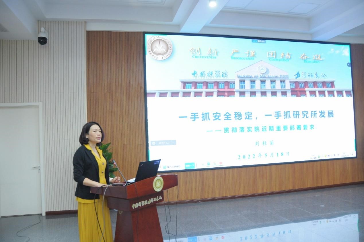 刘桂菊结合研究所2022年工作重点进行了动员部署。她指出,安全稳定事关研究所创新发展大局。各级各部门要树立大安全理念,把安全作为经常性、基础性的工作抓实抓好,确保意识到位、宣贯到位、组织到位、落实到位。她强调,安全不是原地踏步,稳定不是就地躺平。要牢记发展才是硬道理,在抓好安全稳定工作的同时,着力抓好研究所的创新发展工作。要进一步发挥基层党组织的战斗堡垒作用,把党建工作落到实处,加强党支部与行政领导班子的协同,将全体党员、群众的思想和行动统一到发展上来,形成强大的工作合力,营造人人乐于创新、乐于奉献的科研生态环境,以国家战略需求为导向,为实现高水平科技自立自强作出扎扎实实的贡献。