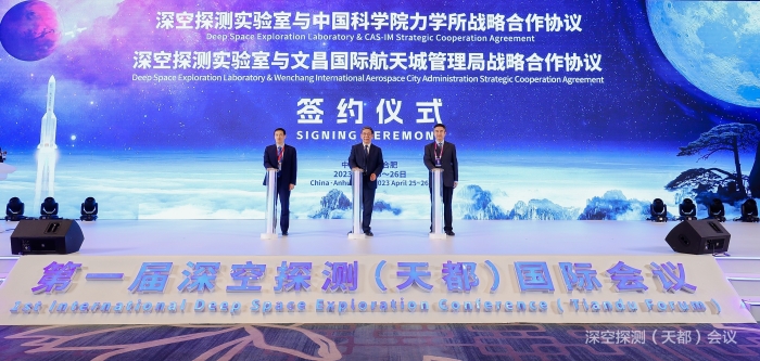 4月25日,在“合作共赢 飞向深空”为主题的第一届深空探测(天都)国际会议开幕式上,深空探测实验室与中国科学院力学研究所签署战略合作协议,并设立“罗喜胜科学家工作室”。深空探测实验室主任吴伟仁、中国科学院力学研究所所长罗喜胜代表双方签约。