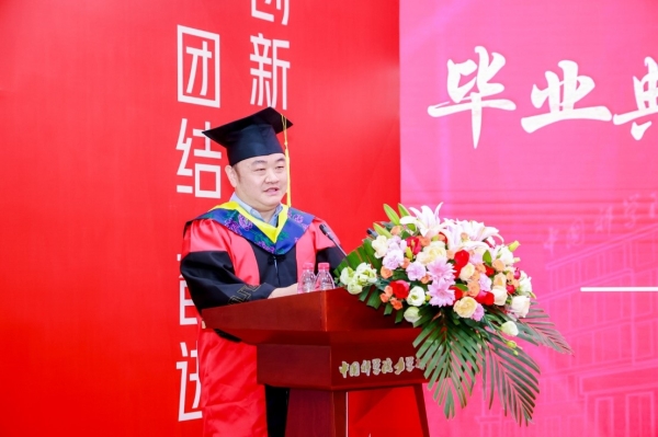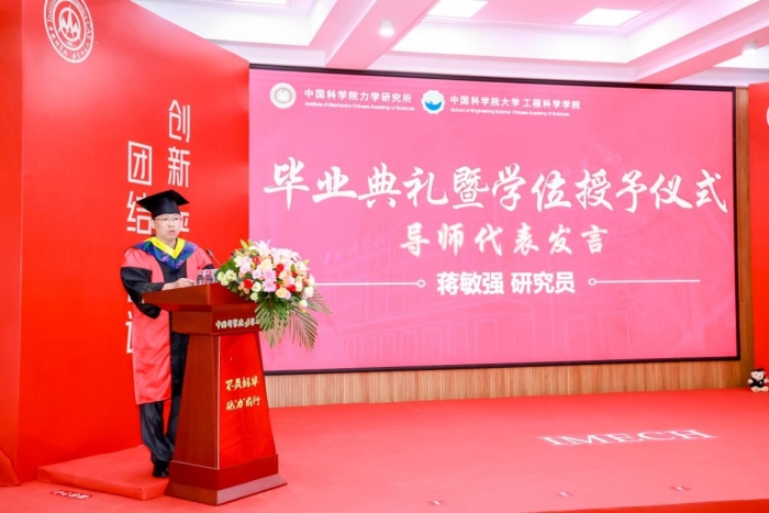 学位委员会副主任蒋敏强研究员作为导师代表发言。他代表全体导师向毕业生以及家人们表示热烈的祝贺。作为导师,他对研究生提出三点希望,第一要诚实守信,认真做事,踏实做人。无论是面对挫折失败、事业低谷,还是手握权力春风得意,都要照章办事,守住底线,不要迷失人生方向。第二要善于学习,讲究方法,小事借力,大事借势。把在力学所积累的科研方法和思维方式与工作有机结合,发现新的切入点,找到新的突破口,敢做先锋。第三要坚持不懈,勇毅前行,像郑哲敏先生用一生去创立和发展爆炸力学,像俞鸿儒先生几十年如一日深耕激波风洞。他希望毕业生十年磨一剑,长期积累,成为不同领域的行家里手!
