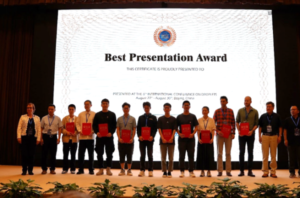本次大会经国际科学委员会讨论决定授予10名学生和5名青年学者最佳报告奖项(Best Presentation Award),由液滴系列会议主席Doris Vollmer教授宣布并于闭幕式颁发获奖证书。