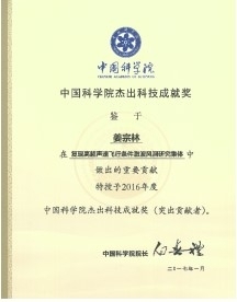 力学所“复现高超声速飞行条件激波风洞研究集体”荣获2016年度中国科学院杰出成就奖,姜宗林研究员、赵伟研究员、俞鸿儒院士荣获该研究集体突出贡献者。2017年1月16日,中国科学院院长、党组书记白春礼在全院工作会上向本次获奖的研究集体/人颁发了获奖奖杯、奖章及证书,姜宗林研究员代表集体领奖。