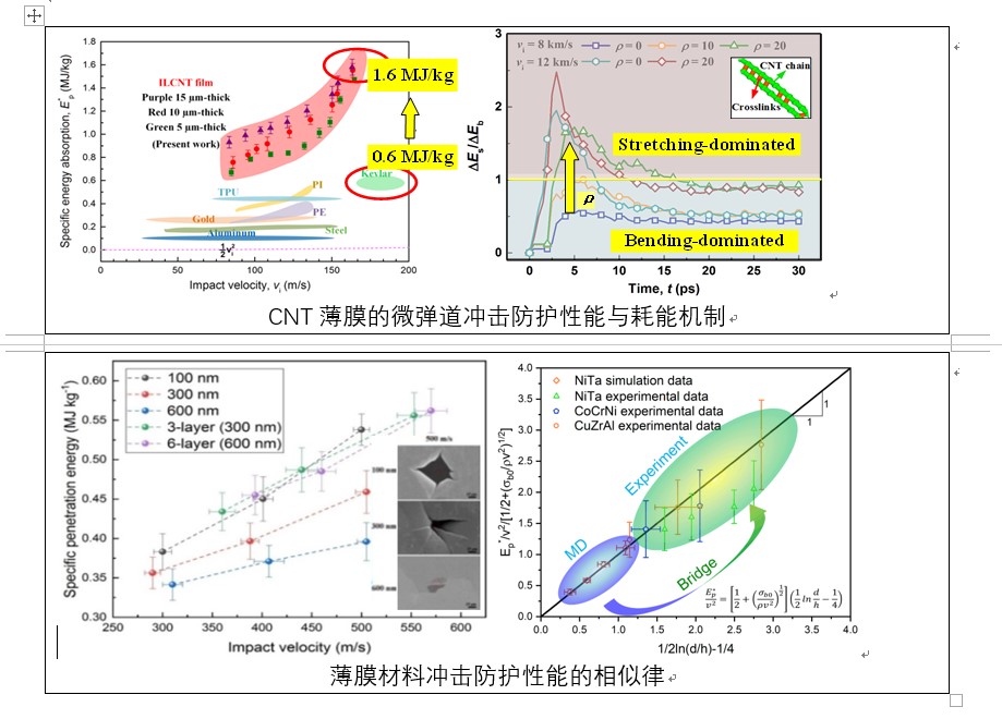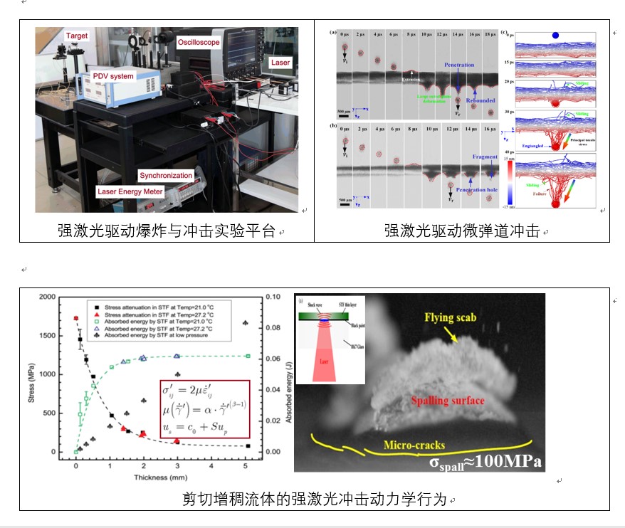 将强激光作为先进加载技术,建立了强激光冲击加载、强激光水下爆炸、强激光驱动微弹道冲击等系列的强激光驱动爆炸与冲击实验技术,提出并验证了强激光效应的相似律,丰富了传统爆炸与冲击加载技术。利用强激光加载实验技术,重点研究了几种具有重要工程应用价值的冲击防护材料的动态力学性能,发现了剪切增稠流体拉伸固化等新现象,澄清了有关形状记忆合金相变发生与发展条件的争论,揭示了碳纳米管薄膜等薄膜材料超高冲击防护性能、耗能主导机制与动态尺寸效应,提出了基于力学原理的高防护性能设计方案。基于该项目的研究,建立了吸引众多优势团体的开放性实验平台;支撑了相关战斗部、军用电子器件防护材料设计;提出了新概念激光水下发射、多发齐射和冰区发射新原理。